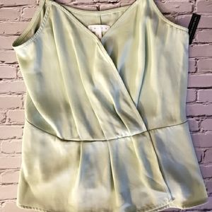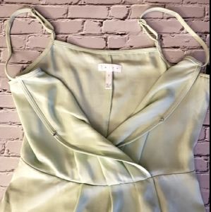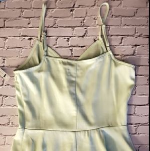 This mint green top is made of 100% polyester. Spaghetti straps, there is a clip in the front of the shirt shown in the (4th picture). This shirt is a short shirt, not long enough to pull down. There is a zipper on the side in the (7th picture).