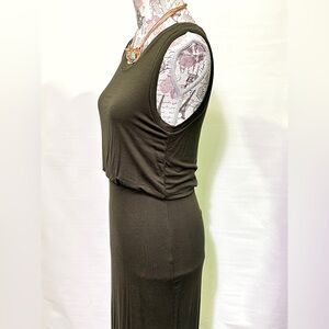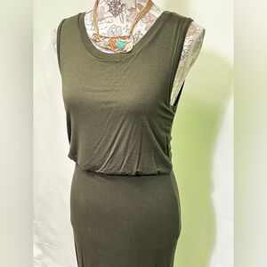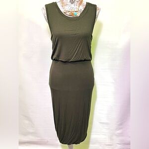 Olive green scoop neck ruched bodycon midi dress by LEITH, size M.