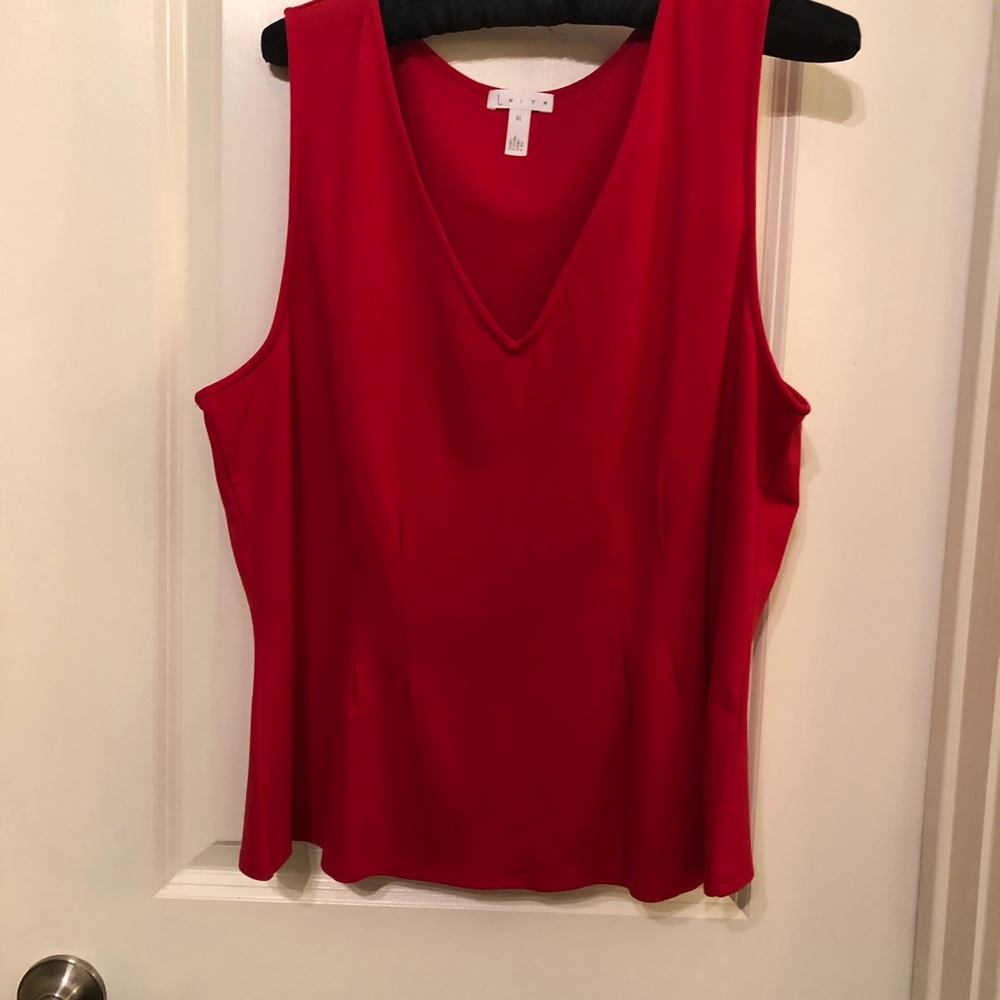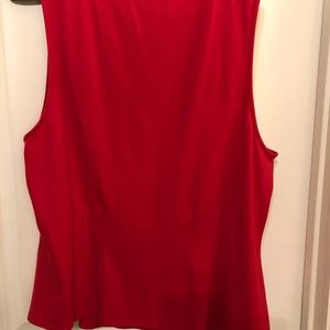 Sleeveless, V-neck, bright red top with darts in front and back. 20” armpit to armpit 24” long Fabric is polyester and spandex NWOT