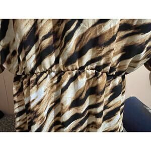 Unleash your inner wild with the LEITH mini dress featuring a daring deep V-neck and chic short dolman sleeves that perfectly blend comfort and style. Made from lightweight 100% polyester in a trendy tan brown and white tiger stripe print, this plus-size piece is the ultimate statement for any fashion-forward wardrobe, effortlessly transitioning from day to night with its playful yet sophisticated vibe!