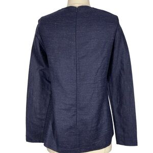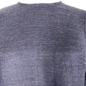 Features: multi-blue weave, long sleeves, back zip. No fabric tag. Pre-owned, excellent condition.