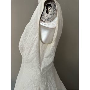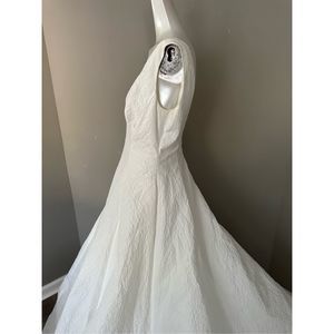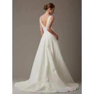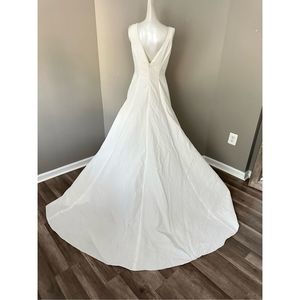 The Stream is made of matelasse fabric, which is handmade in Italy and has a tulle overlay. It also has a deep V neckline and a sheer tulle overlay across the neckline