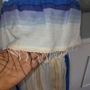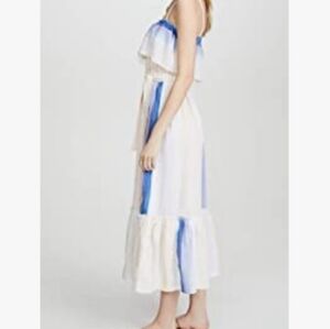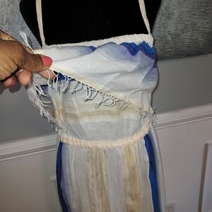 summer striped dress with straight elastic neckline with overlay fringed ruffle detail