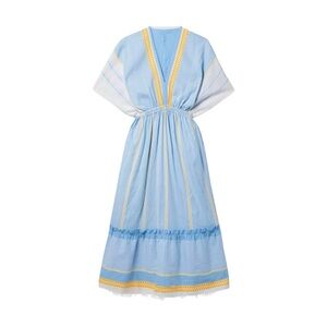 The Jemari dress has a silhouette resembling a refined caftan. The multi-striped frock boasts a relaxed over-the-shoulder dolman sleeve that’s trimmed in a coordinating ribbon, an angled cinched waist. a one-tier skirt, finished with wispy trim along the hem.