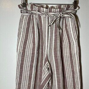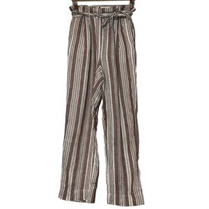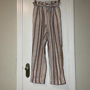 lemlem x H&M. Pants in airy linen. Featuring a high paper bag waist with covered elastication, a mock fly and pleats at the front. Detachable, jacquard weave tie belt that can be wound twice around the waist. Diagonal side pockets, an open back pocket and gently tapered legs. Some of the linen content is organic.
