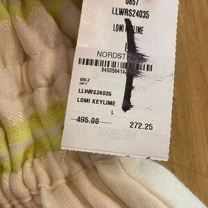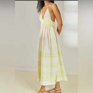 New LemLem summer halter maxi dress in size large. Called gete halter dress in lomi key lime. Pockets, side slits, and stretchy high waist. The front pit to pit measurement ranges from 15 inches to 17.5 inches. The length is approximately 50 inches from what would be the back of the neck to the end of the dress however, the straps can adjust changing that length measurement by one or 2 inches either direction. thank you for considering my item 🌻