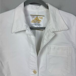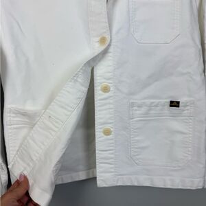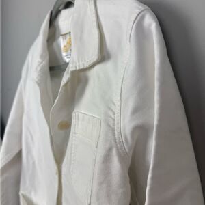 Nice white work jacket by Le Mont St. Michel. An original chore coat! Straight fit. 3 patch pockets. French button placket. Lapped seams. Great preowned condition with just a few marks on the inside of the collar area as shown. Men’s or women’s size 38 (fits like a US women’s 6-8).