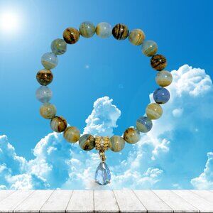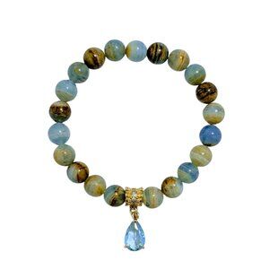 Brand new, made of 8 mm natural lemurian Aquantine calcite beads, cubic zirconia bead, glass charm, size 7 in