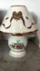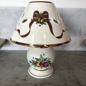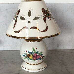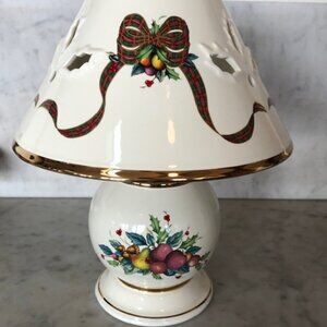 The two-part ceramic lamp is comprised of a rounded base and integral metal frame that supports the removable shade. Cut-out holly leaves in the shade allow the candle flame to show through and heat to dissipate. Tartan ribbon tied in three bows circles the shade, while the base is decorated with two bunches of holly, fruit, and acorns. Rims are trimmed with 24-carat gold. Coordinating with Lenox's Holiday Tartan dinnerware pattern, the fine china lamp is glazed a warm ivory color.