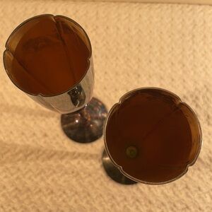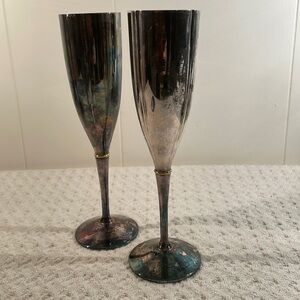 Hand chased Silver plated VintageSet of two Champagne Goblets for accent and elegant. I attempted to clean one of the Goblets for a better visual. I’ll never use them and leave it up to you.