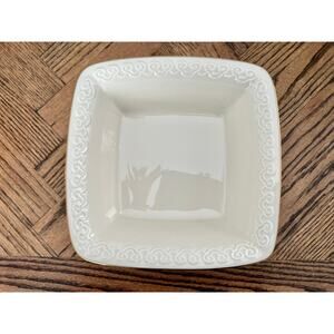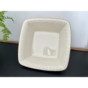 This is a vintage square serving dish from The Persian Collection by Lenox. Made in the USA. The serving dish is embellished with a gold trim and has an embossed scroll design.