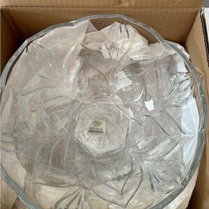 NIB (Never Used). Dimensions: 11.75 inches in diameter, 5 inches tall. Full lead crystal. 8.7 lbs.