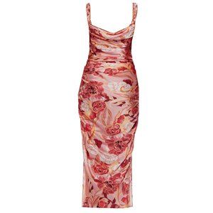 Description: Leo Lin Pink Multi Rachel Adorn Print Cowl Neck Slip Dress in Passion.