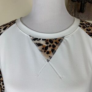 Leo Rossi cream knit top with animal print long sleeves. New without tags with original packaging