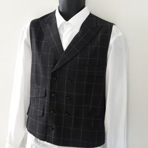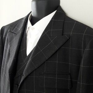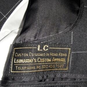 This awesome LEONARDO's CUSTOM APPAREL Windowpane Suit is grey with white accents. Custom designed in Hong Kong for a prominent Atlanta pastor, this vintage style original comes with a notch lapel 34" long blazer, a double-breasted vest, and pleated, baggy pants with built-in suspender buttons. Blazer size: 44 Long. Pants: 38/32. Vest has one missing button at bottom, as pictured. Overall, in good, gently-used condition. Best offers welcomed.