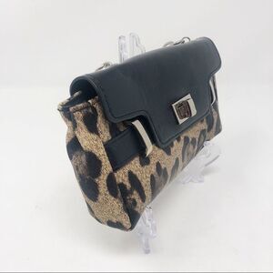 Adorable mini bag!! This has a wristlet style chain strap. Silver twist locking closure. Black and brown animal print. Inside zipper pocket. Great condition. Never used.