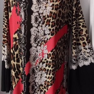 Size medium leopard dress made of 96% polyester and 4% spandex. 35in in length with wide sleeves. Very beautiful and soft material.