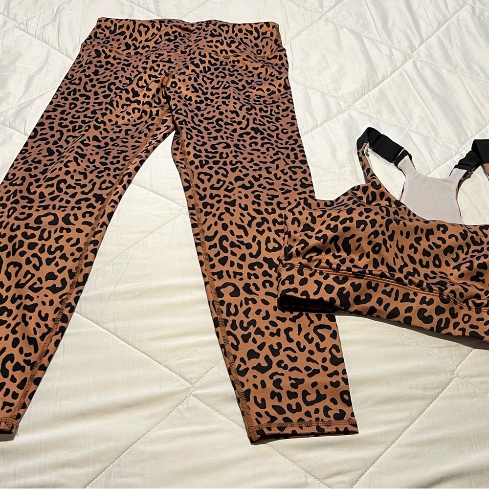 NWOT Two-piece Brown/Black leopard print workout set. Purchased at an online boutique. Sized as XL, fits like a L. Pants are high waisted and soft. Bra had adjustable straps, molded cup padding, and open back design. Never worn.
