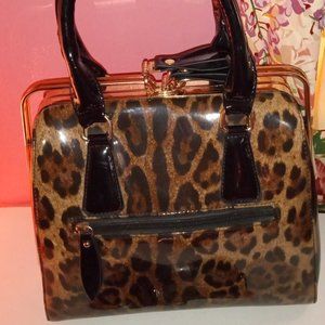 LEOPARD PRINT PATENT LEATHER SATCHEL HANDBAG WITH ATTACHABLE SHOULDER STRAP