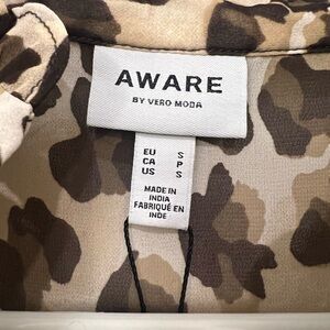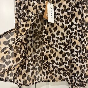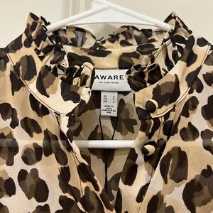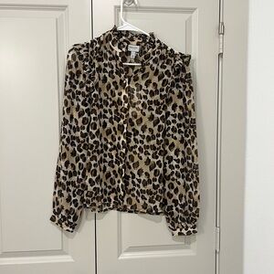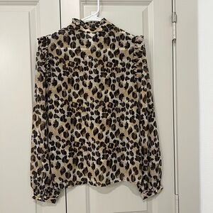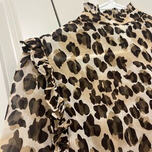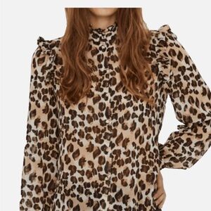 Stylish leopard print blouse. Features ruffled shoulders. Perfect for any occasion.