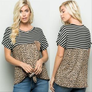 SHORT SLEEVE FRONT TIE SEQUIN POCKET DETAILS WITH STRIPED AND LEOPARD PRINT TOP