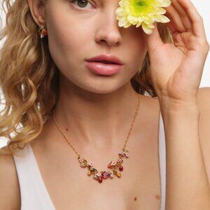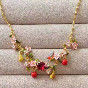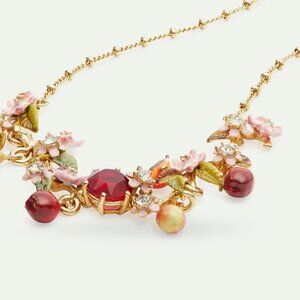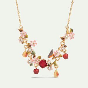 Statement necklace, hanging apples and pears, hand-enamelled robin and apple blossoms. A red agate bead adorns the necklace. Autumn is fast approaching, which means it's time to pick the last apples and pears of the season. Robins and bees are hard at work in the garden of Les Néreides, creating a collection with fresh, tangy hues.
