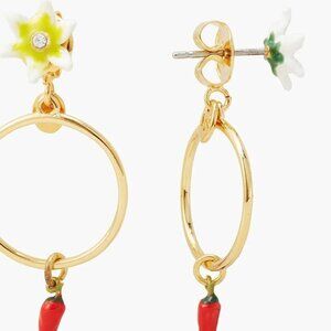 Inspired by summer fruits and chillies, these earrings showcase a white chilli flower with a golden ring and a red chilli pendant. This piece of costume jewellery will bring colour and uniqueness to your style when combined with the chilli pendant necklace.