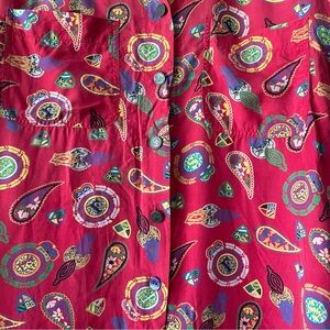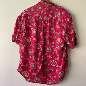 Vibrant red button-up shirt with paisley patterns. Perfect for casual outings.