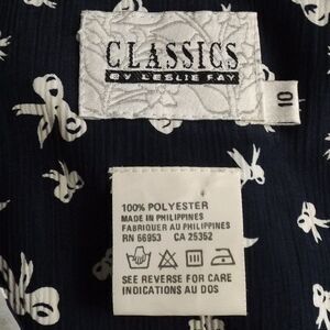 LESLIE FAY Dress, 10, Navy Blue/Bow Print, Sheer layered Collar, Wrap Front