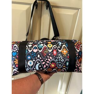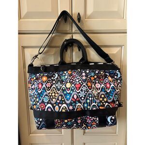 LESPORTSAC Moonflower Duffle Bag in like-new condition. Super cute, whimsical floral and geometric pattern, polyester fabric. Spacious interior, with compartments and pockets. Measures approx 13"H x 9" D x 20"L