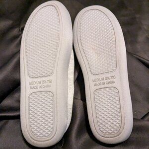A loved one bought these for me not knowing my shoe size so they are in perfect condition. Padded foot bed. Gray slippers with pink and white writing.