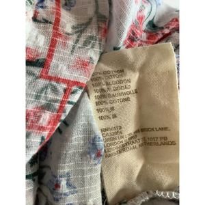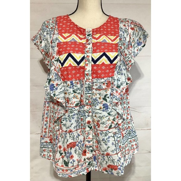 THE TOP IS A MIXED FLORAL AND GEOMETRIC PRINT IN 100% COTTON—FABRIC IS LIGHTWEIGHT AND AIRY WITH A RAISED SWISS DOT TEXTURE—FLUTTER SLEEVES—BUTTON DOWN FRONT.