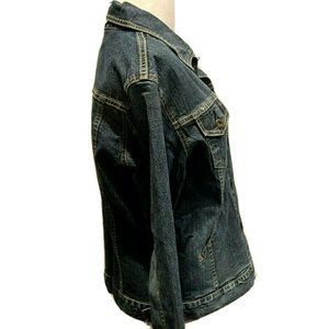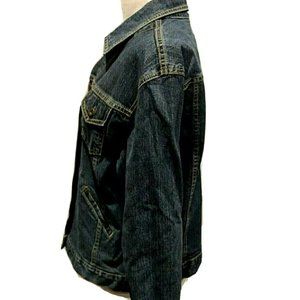 LEVI STRAUSS SIGNATURE Women's Long Sleeve Button Down Denim Jacket, Size M (8/10). This classic denim jacket has a dark blue denim hue, collared neckline, long sleeves, and a button front closure. The material is 99% Cotton and 1% Spandex. The approximate measurements are as follows: Length = 23", Chest = 38", and Waist = 36". All measurements are approximate, start at the end of the tape measure, and taken with the garment laying flat. Accessories are sold separately.