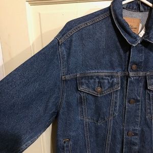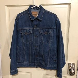 Levi Strauss Signature denim jacket men's size XL..features an art to wear design action figure design on the back...looks to be fabric applique or painted fabric applique on the back with black embroidered outline....jacket is in nice condition with not too much wear....see all measurements for correct fit 20" shoulder to shoulder 21" pit to pit 25 center back length 19" underarm sleeve length 23" shoulder sleeve length