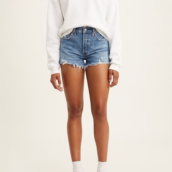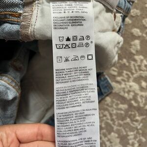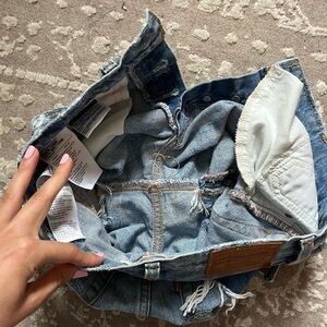 GREAT CONDITION. button up jean shorts, frayed hem, slight distressed look.