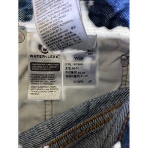 The product is a pair of Levi's 501 high rise shorts for women, size 26. Made from distressed denim blue cotton, these shorts feature a medium wash and are in a regular fit. The style is classic denim, perfect for summer days or casual outings. With the trusted Levi's brand behind them, these shorts are a stylish and comfortable addition to any woman's wardrobe.