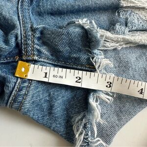 Levi's 501 Quiet Riot Denim Shorts. Button fly and button closure. Belt loop waist. Traditional five pocket styling. Heavy distressing and rips. Frayed hem.