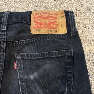 The product is a pair of Levi's 501 men's jeans in size 29x34 with a button fly and straight leg design. Featuring a classic fit and made from black denim with a 5-pocket design, these jeans are suitable for all seasons and are machine washable. The style is a timeless solid pattern with the iconic Levi's logo accents, perfect for everyday wear. Made from cotton, these Levi's 501 jeans are a versatile wardrobe staple for any man looking for quality and style in their clothing choices.