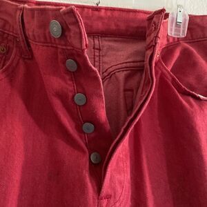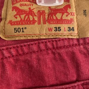 LEVI’S 501 Men’s Red Button Fly Jeans Size 35 in excellent used condition. Inseam length was shortened to approximately 30”