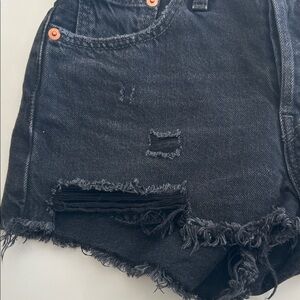 Chic black denim shorts with frayed edges. Perfect for casual wear.