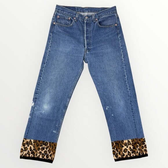 LEVI'S 501xx Straight Leg Button Fly Women's Reworked Cheetah Print Ripped Distressed Denim Jeans Blue Medium Wash