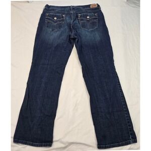 Excellent pre-loved condition in a dark wash with no holes, tears, or major fading. Features distinctive fashion flap back pockets, stretch denim for comfort, and a clean hem.