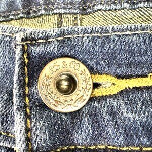 Dark blue wash with distressing, classic pocket, some stretch