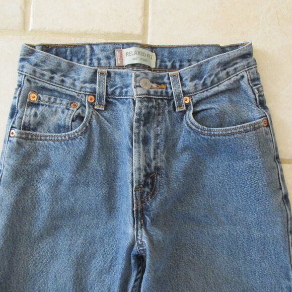 LEVI'S 550 BOY'S SZ 14 (27 X 27) JEANS RELAXED FIT MEDIUM BLUE 5 POCKET STRAIGHT LEG DENIM RED TAB. Fabric: 100% Cotton. Stonewashed denim. Zip front fly with intact and working metal zipper. Silver color riveted button on front waistband says: "Levi Strauss & Co. S F. Cal. Copper colored rivets on front pockets say: LS & Co S.F. Tan trademark label with horses on back waistband. Tan label is stamped with 14 Reg W 27 L 27. See measurements though. Traditional Levi's V back pocket stitching. Traditional gold top stitching. Red Levi's tag on back pocket. Excellent Levi's quality. VINTAGE.