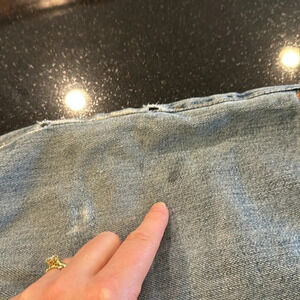 Jeans are distressed and have some holes, 2 belt loops missing and a stain- see pics