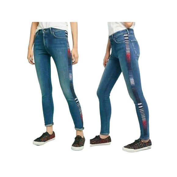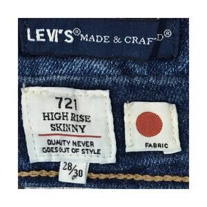 These Levi's Strauss Made & Crafted 721 High Rise Embroidered Trim Skinny Blue Jeans are so unique! Size 28/30. MSRP $198. These high waisted, West Coast blue jeans have a red, white, blue and silver metallic thread embroidered trim on the sides! Has a button & zipper fly. Approximate measurements: Size 28/30; 28" front rise 10, inseam 30". Made of 92% Cotton, 6% Polyester, 2% Elastane.