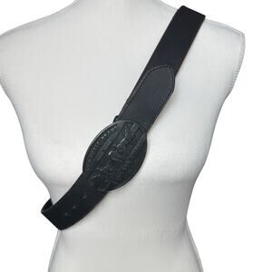 Features: Heavy brass antiqued plate buckle with anchor pin closure. Top stitched genuine leather.
