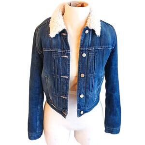 Levi's Strauss Jean Crop length Jacket with front side pockets & cream colored Sherpa faux fur lining. Sleeves are insulated inside with warm, cozy quilted lining.