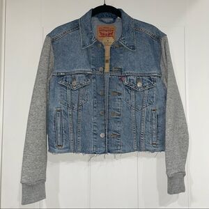 LEVI’S ExBoyfriend Trucker Jacket Medium Wash Grey Sweatshirt Sleeve Frayed Coat