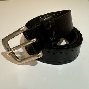 Levi’s Genuine Italian Leather Men’s Black Belt with silver buckle. Back says 36/90 but it would fit a large or X-Large. Belt length is 44”. Belt buckle to center hole measure 40”. Excellent condition. See last pic of holes where belt worn.